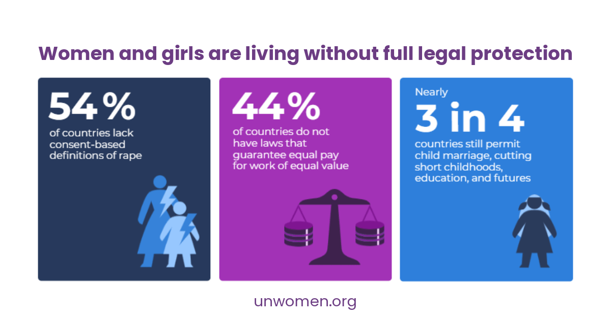 The result: women and girls have just 64% of the legal rights that men have. Women are turned away, not believed, revictimized, or priced out of legal support. Equality never arrives.